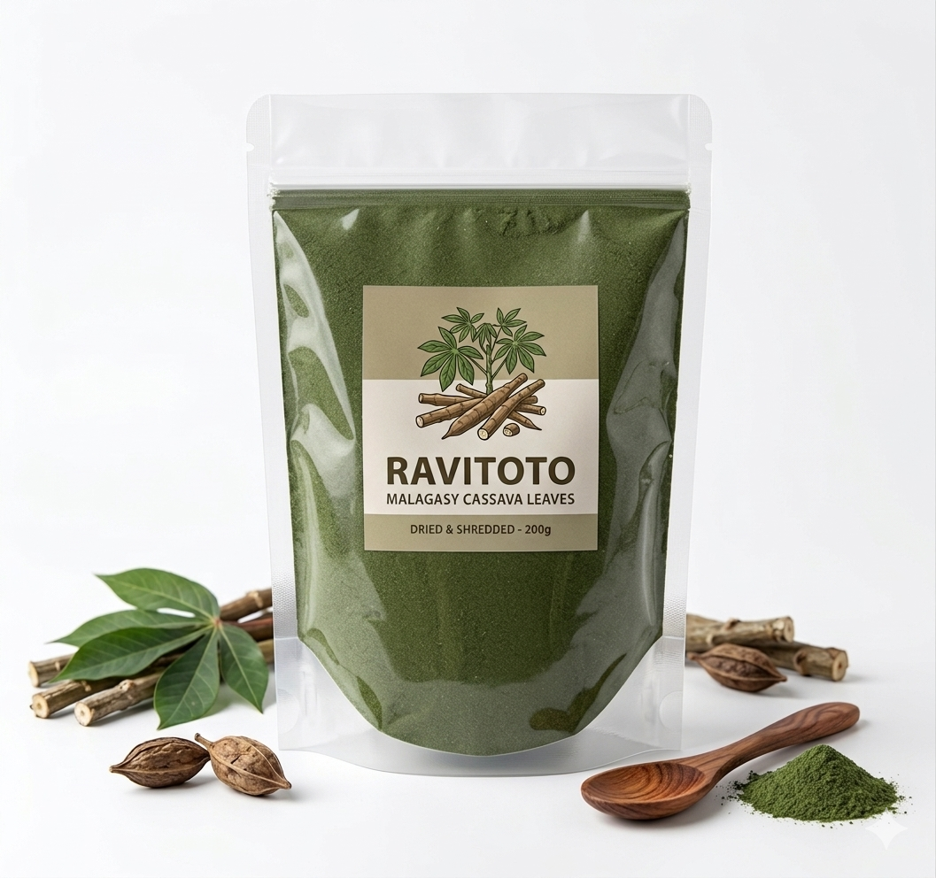 Les Ravitoto séchées sont des feuilles de manioc pilées et déshydratées, prêtes à être réhydratées pour préparer le célèbre plat malgache.